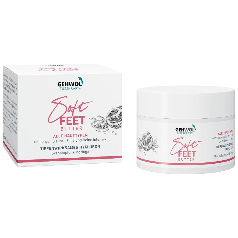 Masło do stóp i nóg GEHWOL FUSSKRAFT® Soft Feet Butter to intensywnie pielęgnujący kosmetyk o bogatej, kremowej konsystencji i owocowym zapachu. Zawiera ekstrakt z granatu i olej moringa, które nawilżają, uelastyczniają i wygładzają skórę, nadając jej jedwabistą miękkość i zdrowy wygląd. Masło shea i olej z awokado wzmacniają barierę naskórkową, wspomagają regenerację skóry, wiążą wilgoć w głębszych warstwach i chronią przed powstawaniem modzeli oraz nagniotków. Dodatkowo kwas hialuronowy głęboko nawilża, wspierając proces odnowy skóry i zapobiegając jej nadmiernemu rogowaceniu.