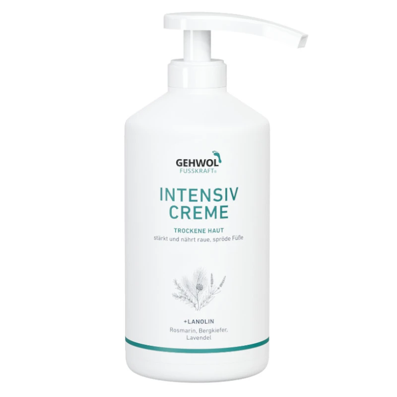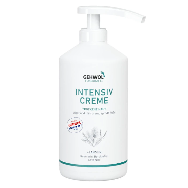 Krem do stóp i nóg GEHWOL FUSSKRAFT® Intensiv Creme z naturalną lanoliną, o bogatej, nawilżającej formule. Wzmacnia i odżywia suchą, szorstką i spierzchniętą skórę, łagodzi uczucie palących i bolących stóp. Aloes i mocznik zapewniają dobre nawilżenie. Aktywne składniki dezynfekujące niezawodnie chronią przed grzybicą stóp i swędzeniem – nawet między palcami. Naturalne olejki eteryczne z rozmarynu, sosny górskiej, lawendy, kamfory i mentolu doskonale orzeźwiają i odświeżają. To również dzięki nim krem ma charakterystyczny zapach. Dostępny w dużym, ekonomicznym opakowaniu z wygodną i higieniczną w użyciu pompką. Kosmetyk dobrze się wchłania. Sprawia, że stopy są zauważalnie bardziej miękkie i gładkie. Polecany dla diabetyków.
