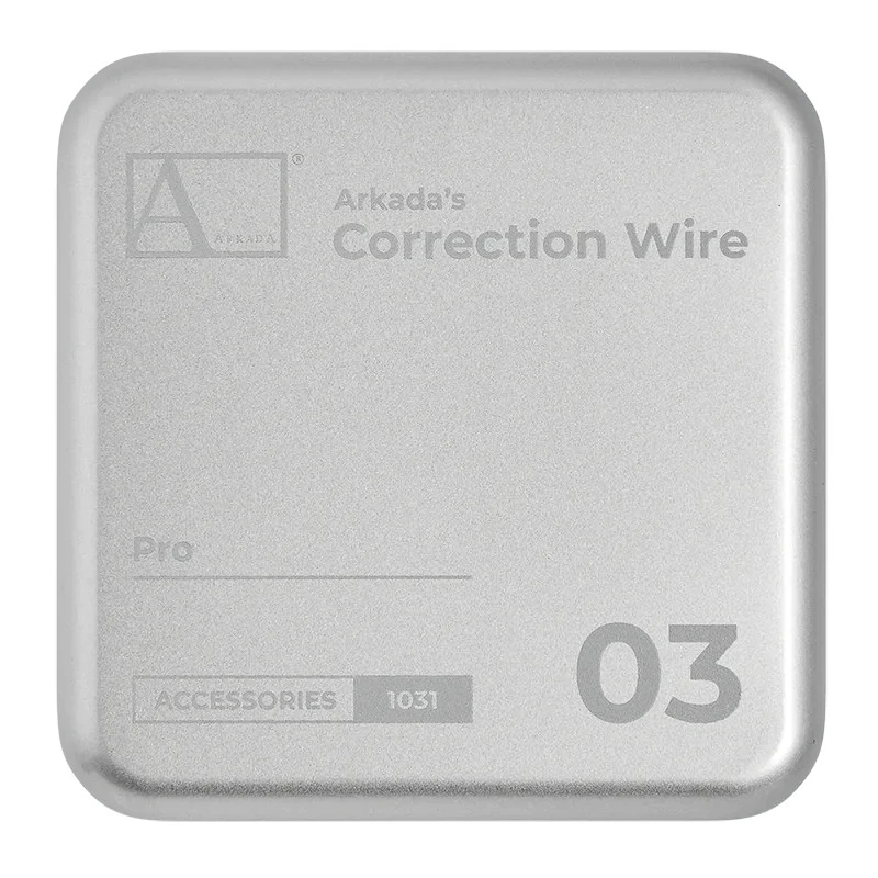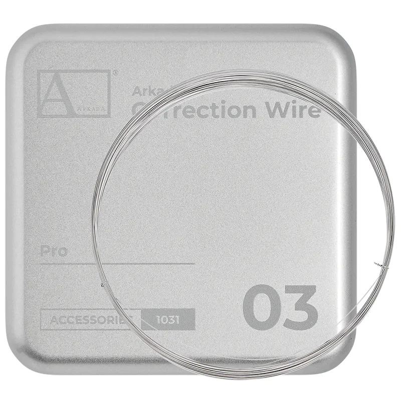 Drut korekcyjny Correction Wire 03 wykonany ze stali chirurgicznej implantacyjnej, przeznaczony do samodzielnego formowania klamry M z zastosowaniem narzędzia Arkada's Brace M lub Arkada's Brace M Mini marki Aarkada. Cechy produktu: