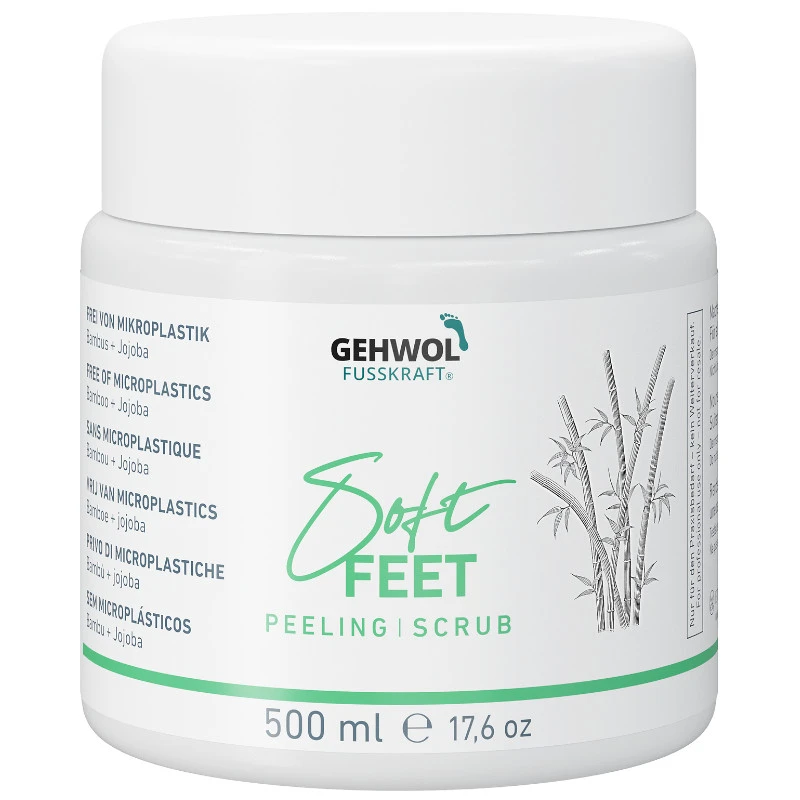 Peeling do stóp GEHWOL FUSSKRAFT® Soft Feet Peeling / GEHWOL FUSSKRAFT® Soft Feet Scrub zawiera substancje aktywne, takie jak: olej jojoba, olej z awokado, bambus, ekstrakt z miodu, witamina E. Polecany jest do skóry szorstkiej, suchej, łuszczącej się, a także normalnej. Wskazany dla diabetyków.