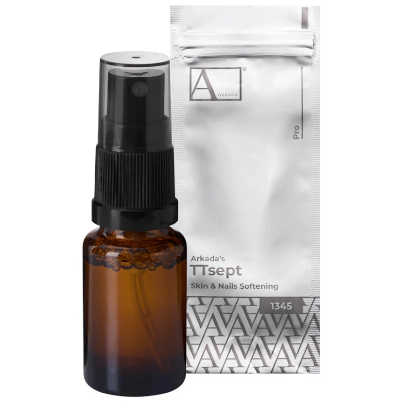 TTsept Aarkada to keratolityczny roztwór wodny - gotowy produkt o potrójnym działaniu: zmiękczającym, oczyszczającym i ochronnym, do szybkiego oczyszczenia obszarów zrogowaciałej skóry i paznokci. W kontakcie ze skórą zmienia się w aktywną pianę, dzięki czemu z łatwością utrzymuje się na jej powierzchni. Aktywna piana wnika głęboko w zrogowacenia dzięki czemu ich usunięcie jest bardzo łatwe. TTsept jest wygodny w użyciu, nie zapycha frezów w trakcie pracy. Zmiękcza i ułatwia opracowanie paznokci, odcisków i modzeli. Zmniejsza napięcie powierzchniowe wody umożliwiając wnikanie substancji do głębszych warstw skóry. Ułatwia i przyspiesza wykonanie zabiegów podologicznych oraz pedicure i manicure. Preparat TTsept jest wydajny i skuteczny, chroni przed bakteriami, nie wysusza skóry. Neutralizuje nieprzyjemny zapach.